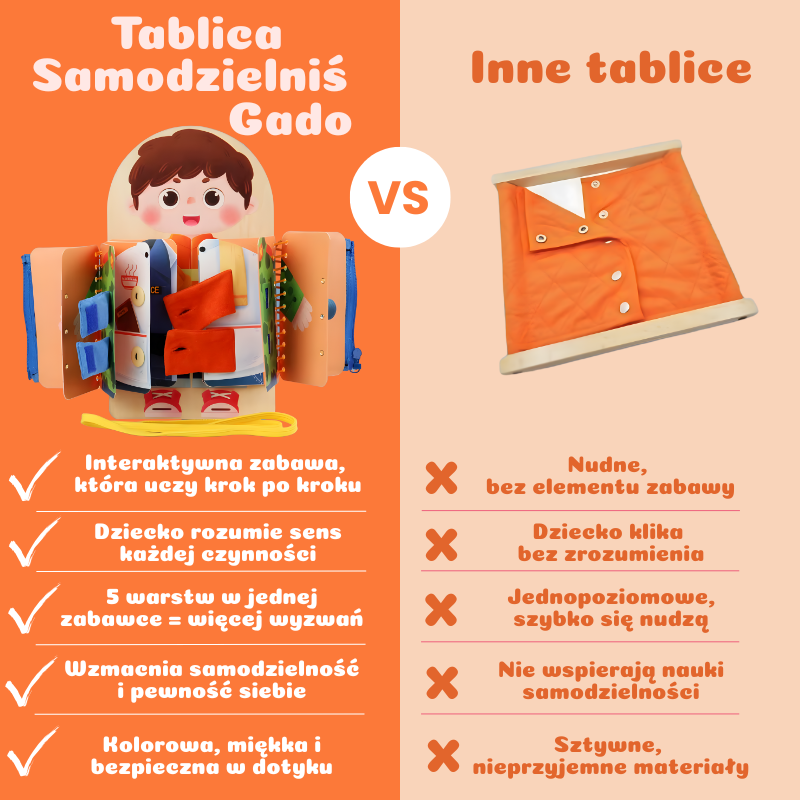 Zestaw obejmuje jedną tablicę Samodzielniś Gado, na której Twoje dziecko: