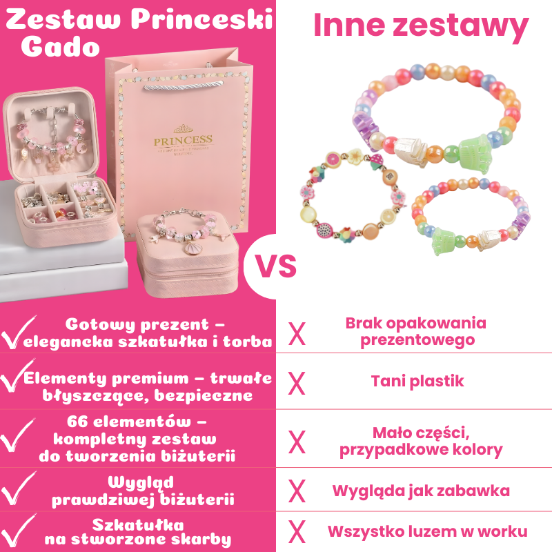 Zestaw princeski Gado zawiera 3 bransoletki typu Pandora, 3 łańcuszki, 60 kryształowych charmsów, a także torbę prezentową i szkatułkę gratis.